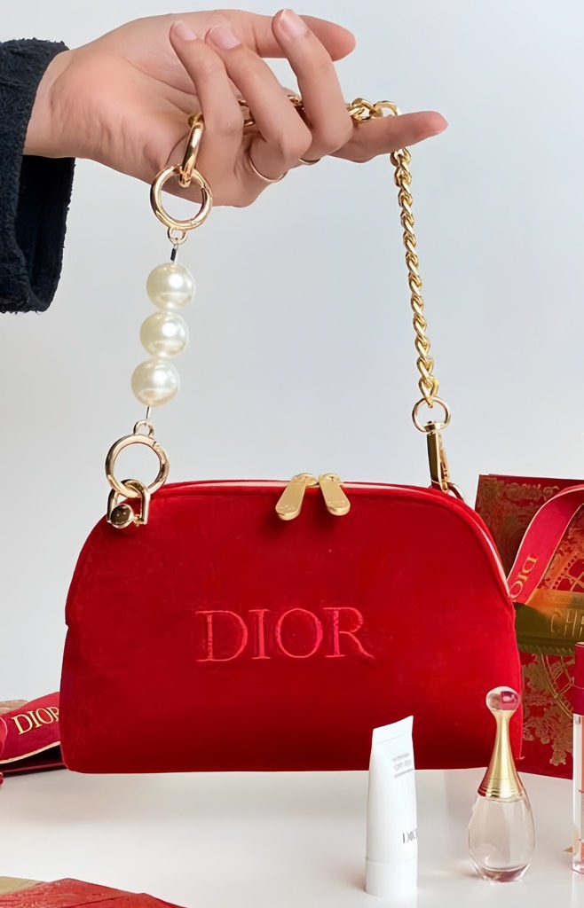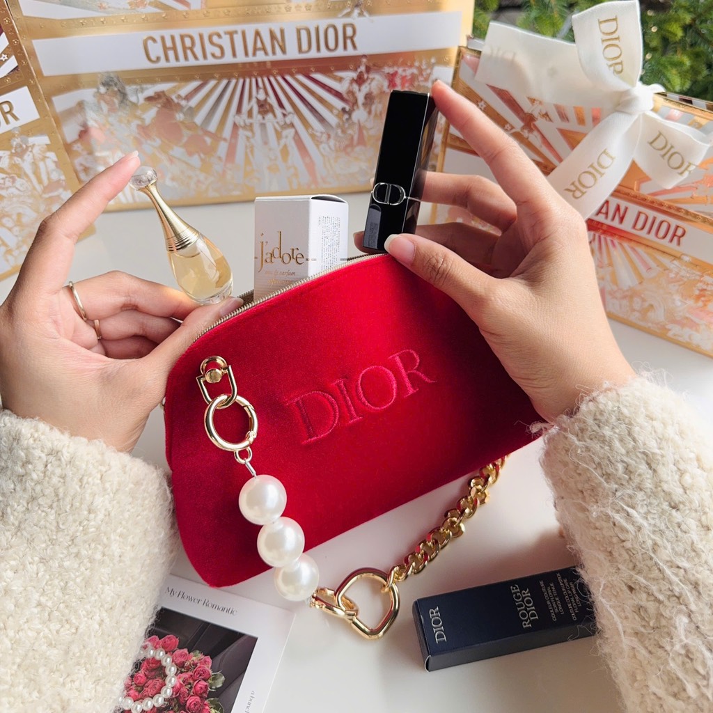 3. Túi gift nhung đỏ Dior holiday 2025 đã mix dây ngọc