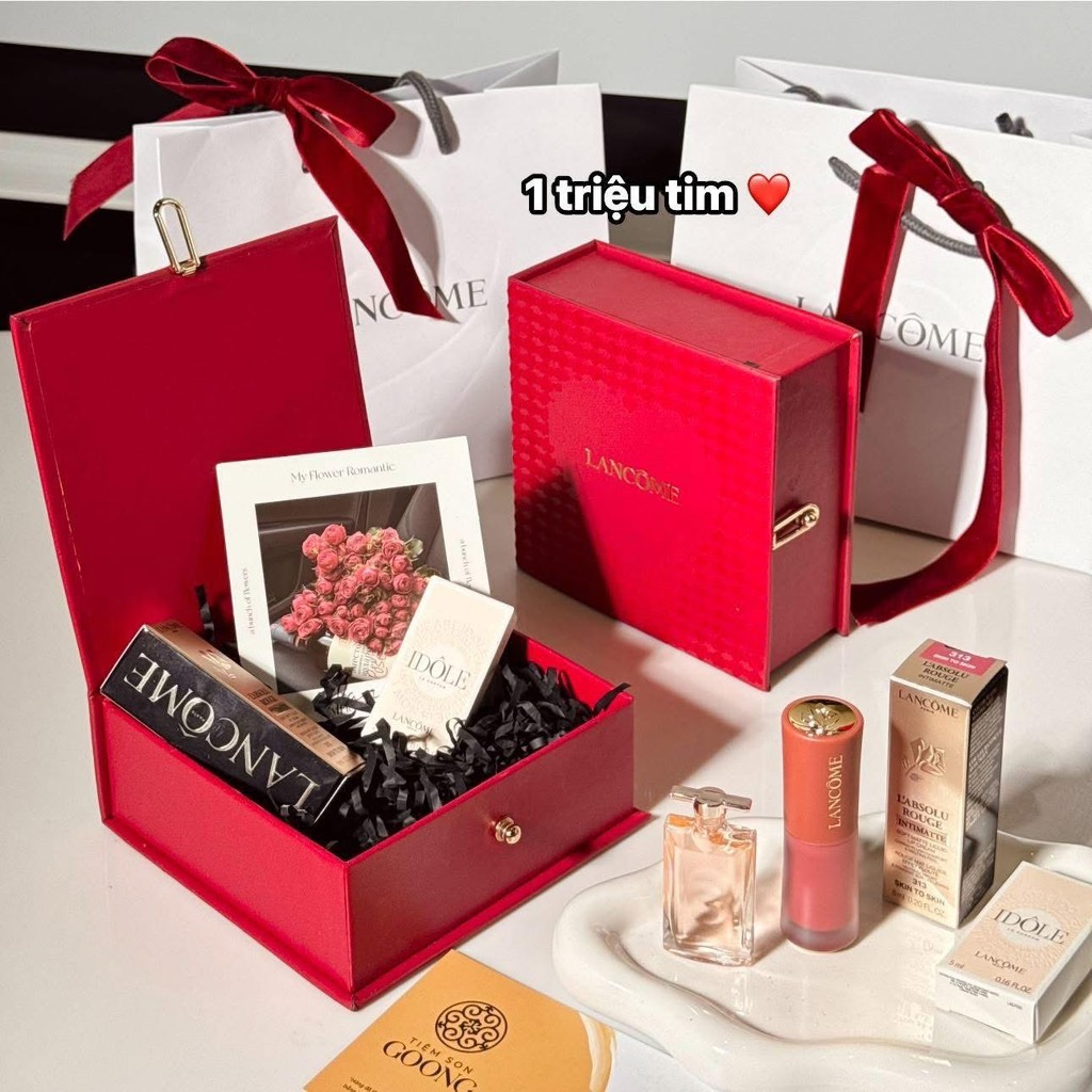 - hộp đỏ kèm túi giấy hãng Lancome đi kèm